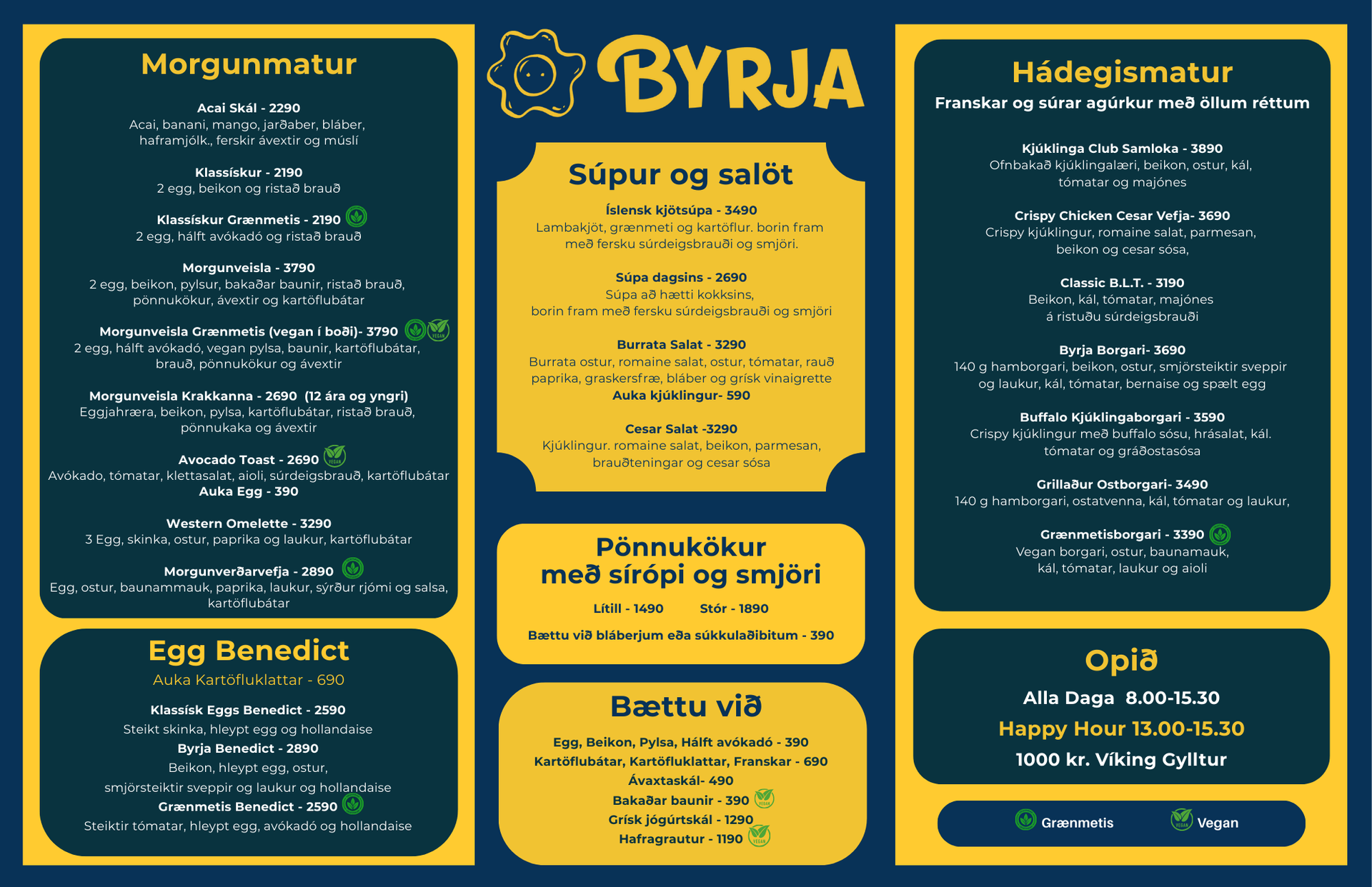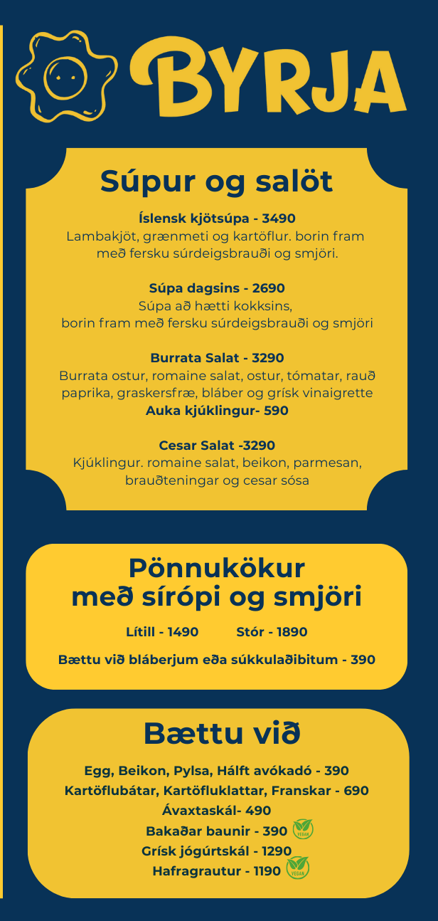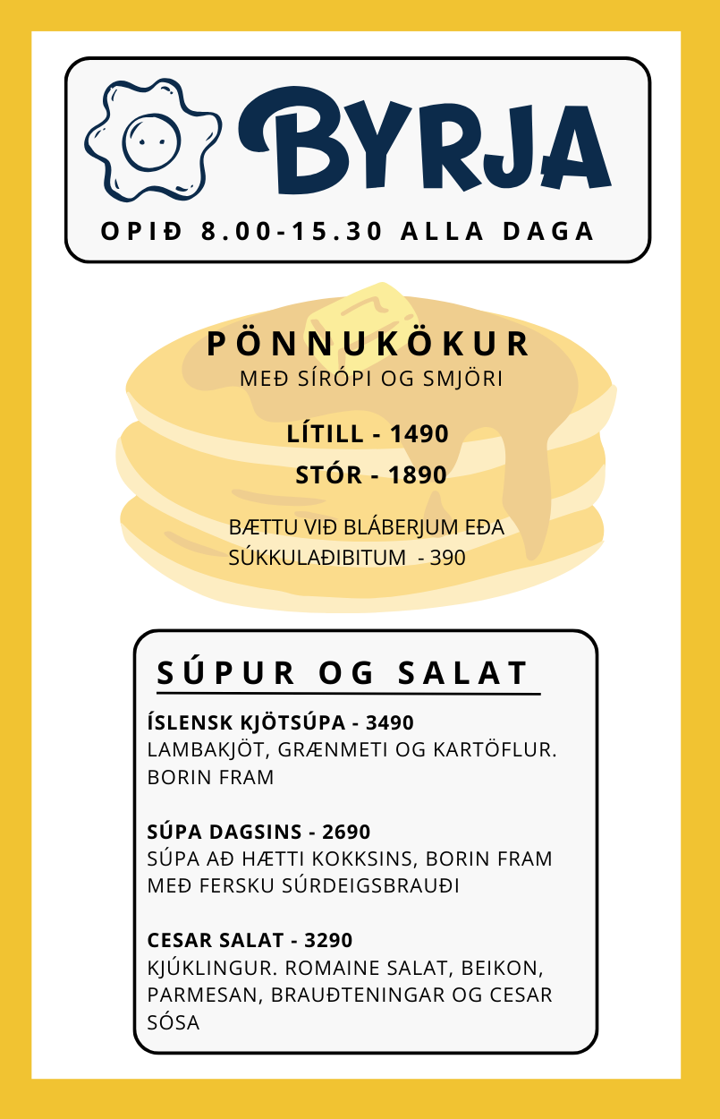 Byrja er staðsett á Selfossi að Austurvegi 3 (í Krónuhúsinu) og býður alla gesti velkomna til að njóta góðra veitinga. Við opnum snemma fyrir morgunmat og í hádeginu er boðið upp á súpu og ýmsa rétti fyrir alla aldurshópa.